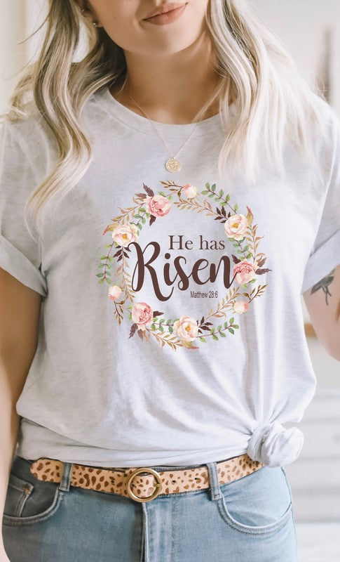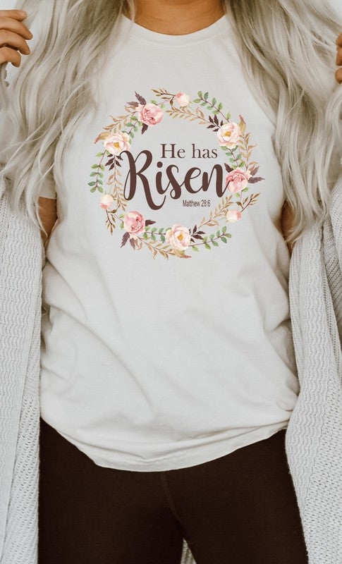 Floral He Has Risen PLUS SIZE Easter Graphic Tee By Kissed Apparel. White, Cream and Citron tees are 100% cotton, Ash tees are 99/1 cotton/poly. Peach is 52/48 cotton/poly.