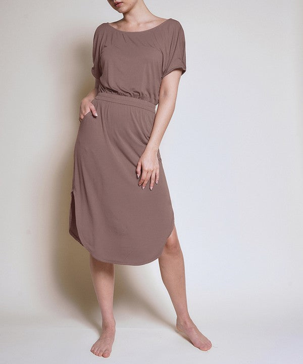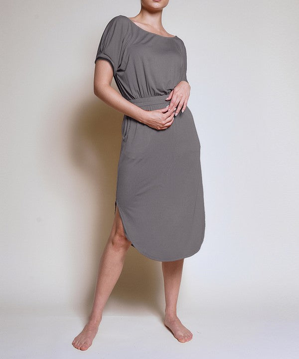Organic Bamboo tulip shape Dress. The relaxed fit of this dress makes it perfect for any occasion. Plus, it's made from highly sustainable materials which means it will stay looking new wear after wear., , Eco-Friendly, Puff Sleeves, Tulip shape Dress, Functional Pockets, Wide Scoop Neckline