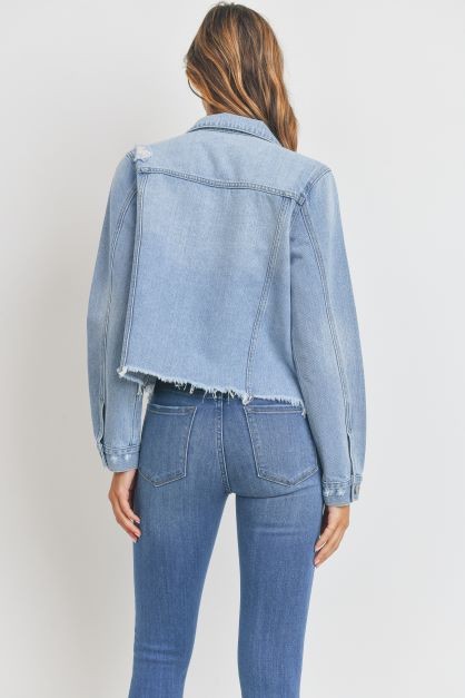 VINTAGE DISTRESSED DENIM JACKET WITH DISTRESS AND FRAY HEM IN LIGHT WASH DENIM