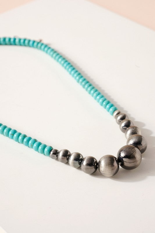 Western inspired necklace with metallic pearls and semi-precious stones. Includes matching metallic pearl dangling earrings.